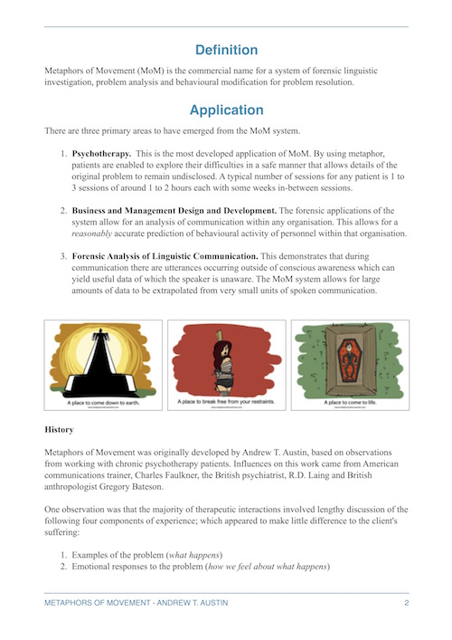 Metaphors of Movement takes the guess work out of change work. It is a precision tool to help you home in on the client’s exact stuck point and how they are maintaining their problem state.